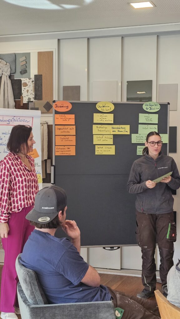 Bereits im Jahr 2024 wurden unsere Bemühungen mit dem BGF-Siegel ausgezeichnet – eine Anerkennung, über die wir uns sehr freuen. Auch für die kommende Periode streben wir diese Auszeichnung wieder an. Im heutigen Workshop haben wir gemeinsam konkrete Maßnahmen erarbeitet, mit denen wir Gesundheit und Wohlbefinden in unserer Tischlerei weiter stärken möchten. Offene Zusammenarbeit, gegenseitiger Austausch und die aktive Einbindung unserer Mitarbeitenden sind dabei ein wichtiger Teil unseres Weges.