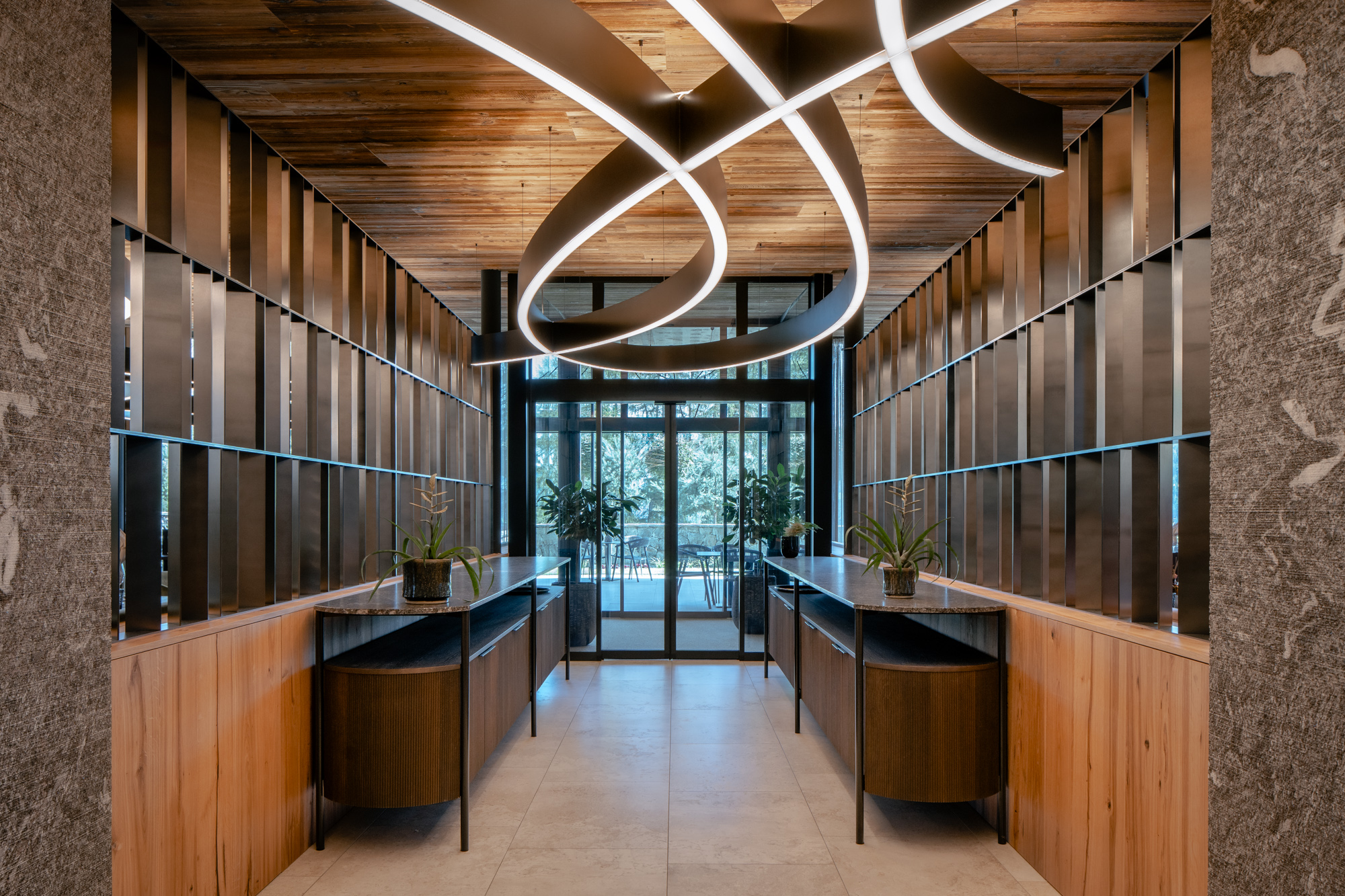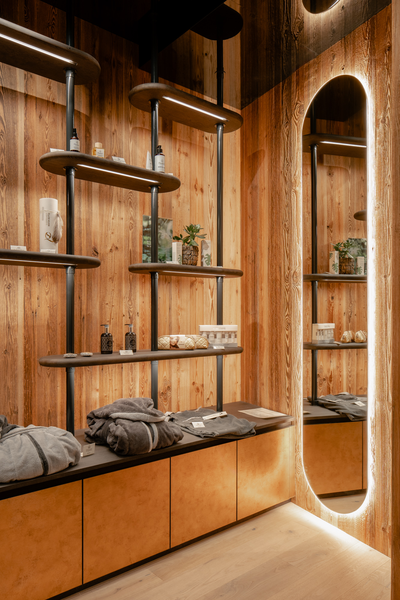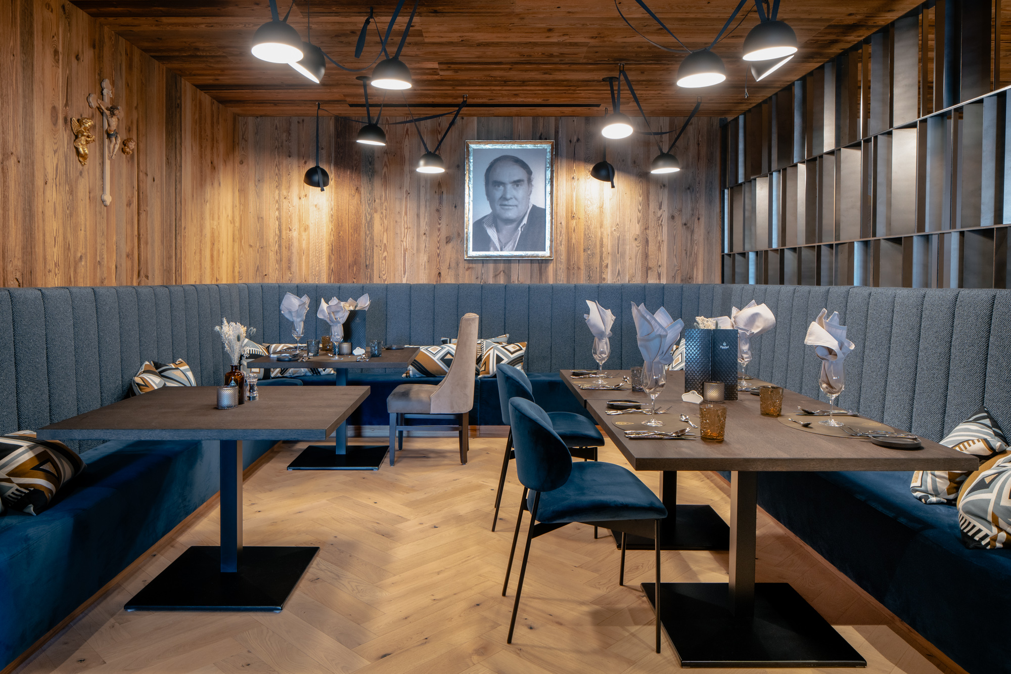 Für die Familie Volgger setzten wir eine Hoteleinrichtung um, die durch das Zusammenspiel von Holz, Stein, Metall, Stoff und Licht eine spürbare Atmosphäre entstehen lässt.