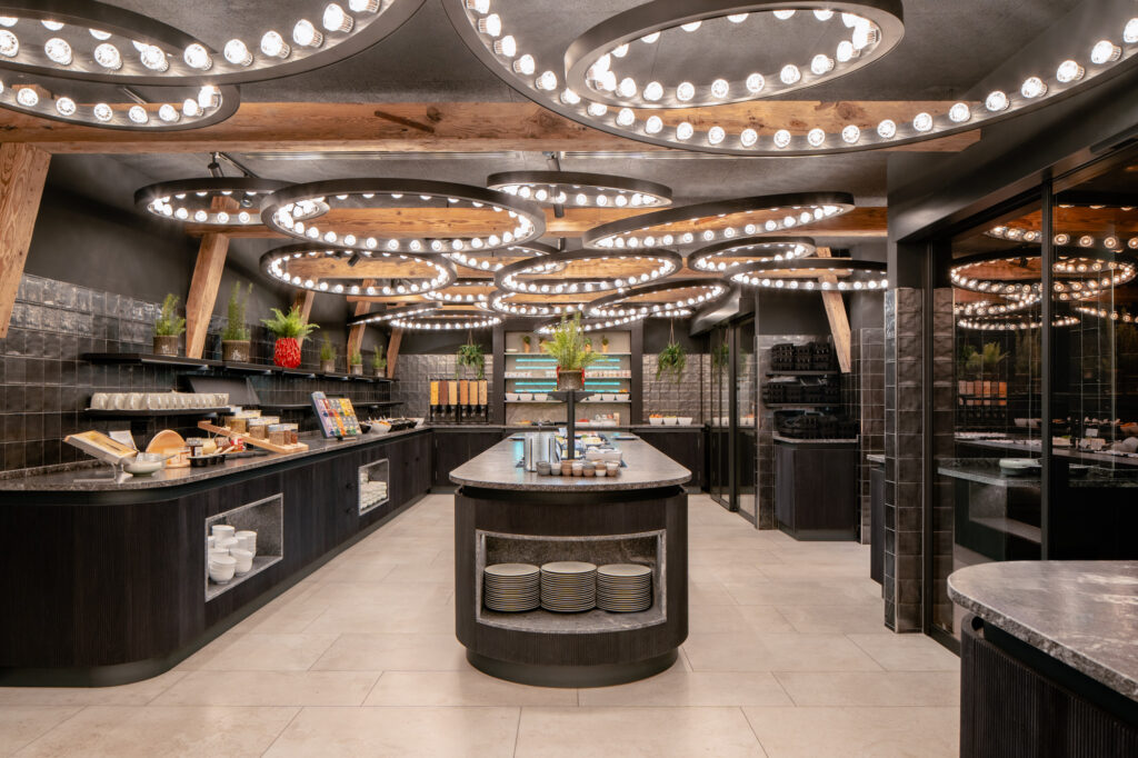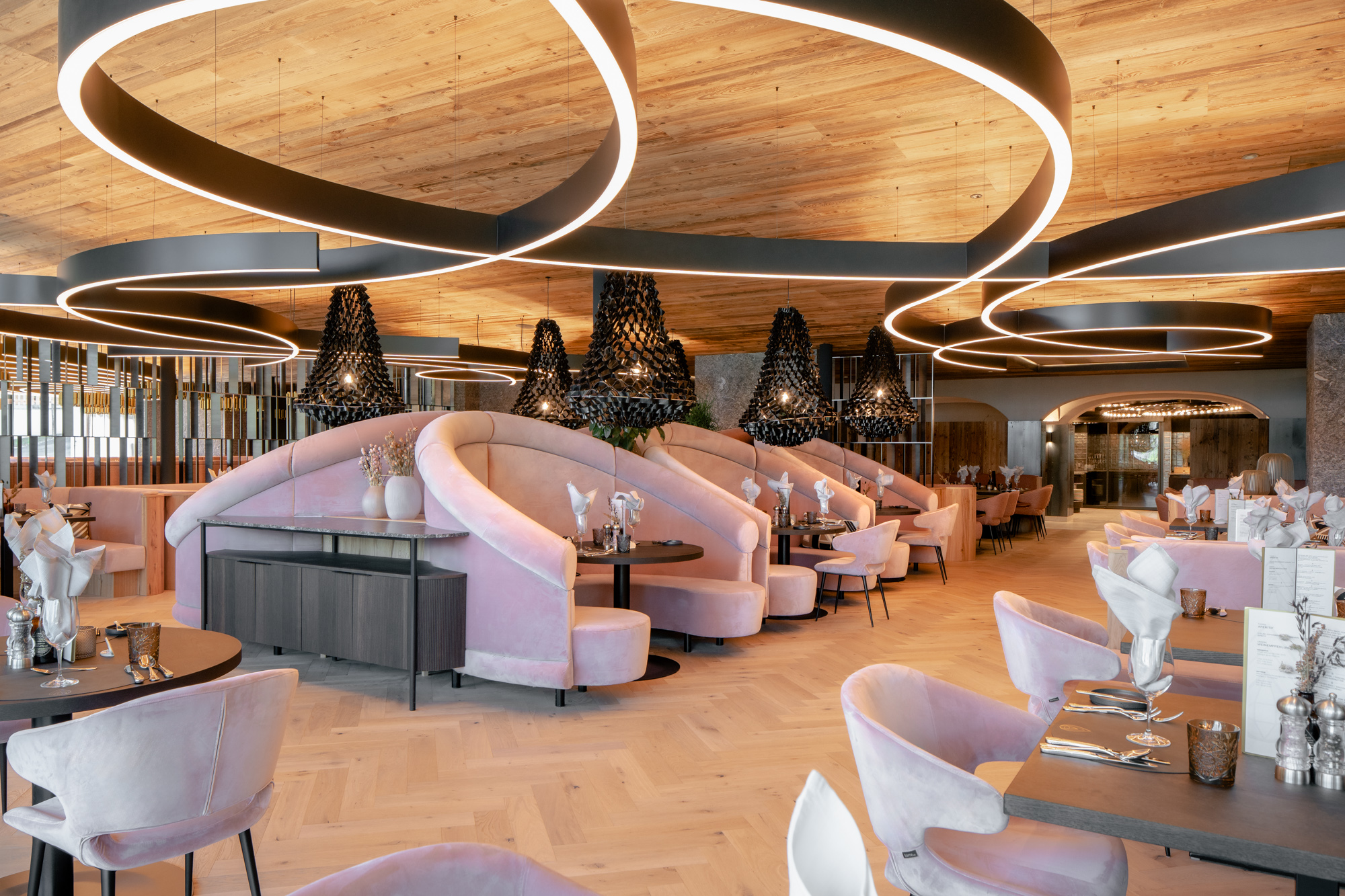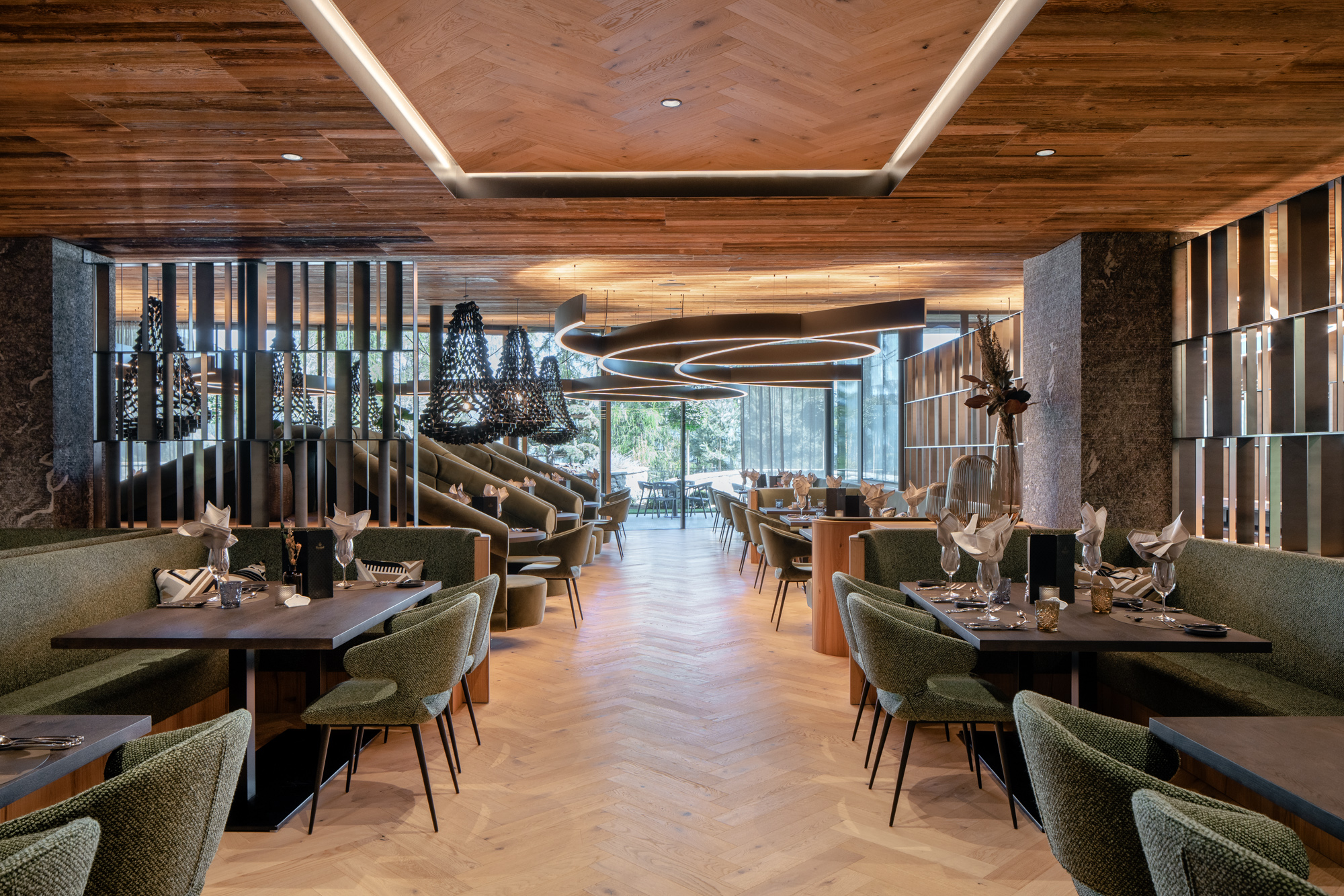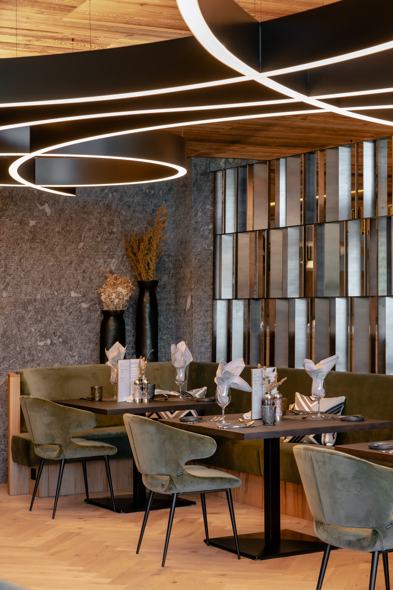 Farblich unterschiedlich gestaltete Sitzbereiche mit geschwungenen Bänken, gemütlichen Nischen, einzigartigen Leuchten und Raumteilern aus Stahl schaffen im Restaurant ein harmonisches Miteinander von Design und Wohlgefühl.